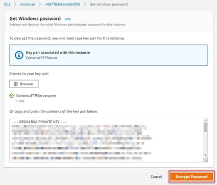 You will now need to get the Windows password for your instance. For this, you will need the key pair you saved on your system. Press ‘Browse’ and locate the *.pem file you save.