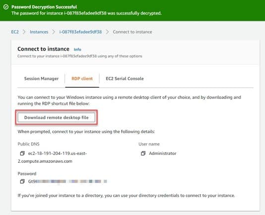 You can now connect to your instance via the RDP client of your choice. Before clicking on ‘Download remote desktop file’, copy the password at the bottom of the window as you will need to enter this when prompted to do so by the RDP client. In this example, we use the Windows RDP client.