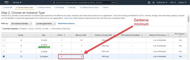 On this screen, you will need to select an instance type appropriate for your use case. Using the Cerberus FTP Server minimum requirements as a baseline, we recommend no less than 2 vCPU’s and 4GiB of RAM. However, if you anticipate thousands of transfers an hour, you may want to consider a more capable instance, such as 4 vCPUs and 16GiB of RAM. Remember that this can be changed later if you find that your instance is having trouble handling the volume, or that you have chosen an instance that is excessive for your use case.