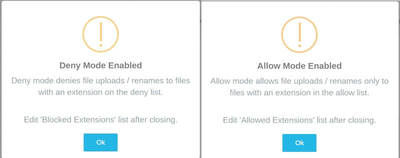 Under the User Manager / (Allowed/Blocked) Extensions tab, the toggle buttons on the upper right corner of the panel control the new Allowed Extensions feature. Its behavior is similar to our IP Manager / IP List feature, where it toggles between settings. Since swapping between modes takes effect immediately, a pop-up dialog alerts admins that changes have been made.