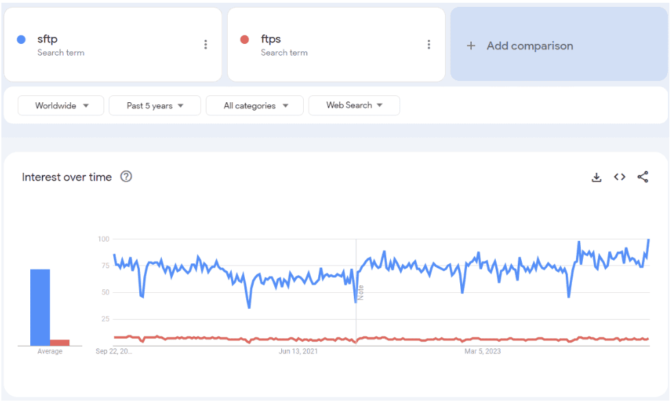 FTPS, which uses the FTP protocol but secures its traffic through an SSH tunnel, is still quite popular due to to its legacy compatibility with systems that were originally built to communicate with FTP. While we weren’t able to find any data on FTPS vs. SFTP usage, using Google Trends data as a proxy it appears that SFTP is much more popular and increasing in popularity in the past few years.