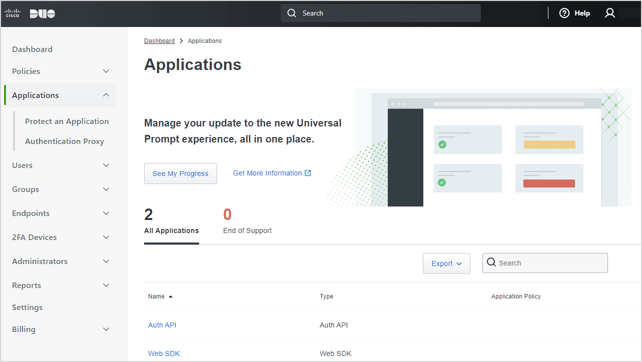 Once you have logged in at least one user, you can go back to the Duo administration page, select the Web SDK application and move from “Show traditional prompt” to “Show new Universal Prompt”.