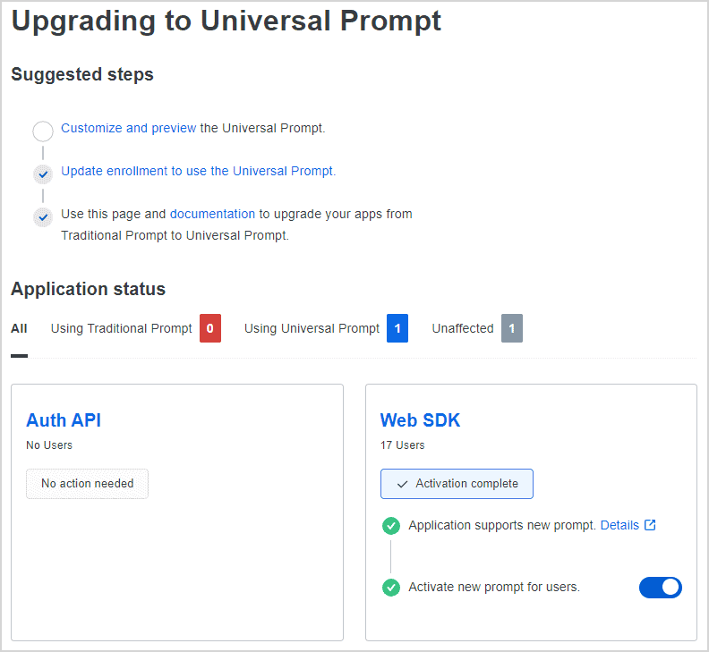 Clicking on the Web SDK application and clicking the “See Update Progress” link in the Universal Prompt section will show you any tasks you need to complete as shown in the screenshot below.