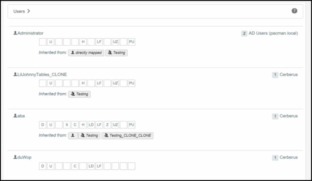 The image above presents examples of expanded user permissions blocks. Permissions show all the ways a user can interact with a folder, and are represented here as a set of blocks – a filled in block being a granted permission and an empty space representing a denied permission. When a virtual folder was directly mapped to a user, as ‘duWop’ from above, there won’t be an “Inherited from” tag. If a user was granted access to a folder via groups, then the specific group will be listed such as from “LilJohnnyTables_CLONE”. Finally, if a user has both a group and a direct mapping to a folder, then a blank icon represents the direct mapping to a native user and in the case of an AD or LDAP user a “Directly Mapped” tag.
