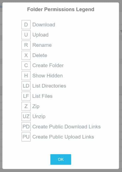 There is a new button to display a legend with the titles of the permission boxes, and mapping the shorthand letters to what rights a user has while accessing that folder. This has been added to all other usages of the folder permissions boxes including user and group management and user report.