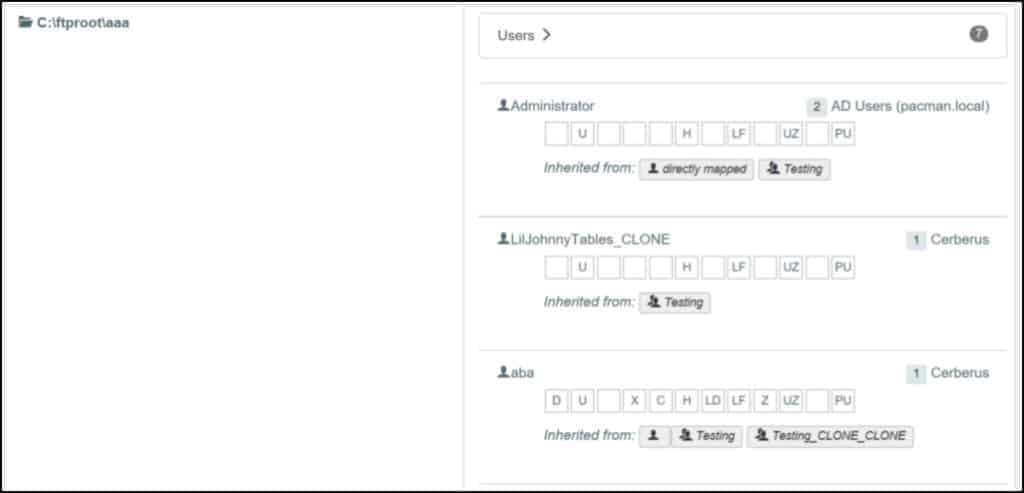 Expanded User Permission block for first of seven users able to access “C:\ftproot\aaa”