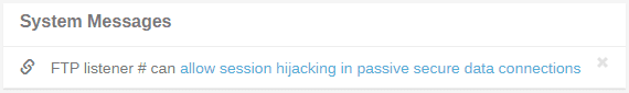 The first part of the message indicates the listener type, FTP or FTPS. The ‘#’ symbol will be replaced with the listener number. The final part describes the risk and links to this FAQ article.