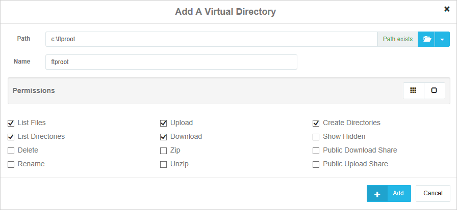 Cerberus FTP Server offers a virtual directory system allowing the administrator to attach any directory or drive to a user account’s root folder. Having a virtual directory (VD) gives administrators the ability to customize user account permissions to designated folders.