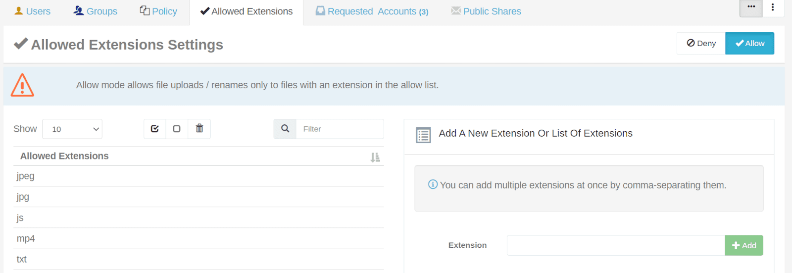 Maintain compliance, avoid malicious transfers, and better manage resources with Cerberus FTP Server’s Extension Management feature. Configure your server to allow or deny file transfers by extension in order to eliminate problematic data exchanges.
